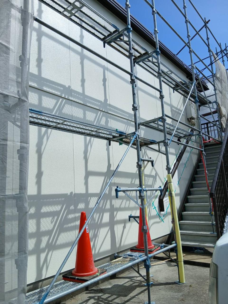 外壁塗装、軒天、雨どい、軒先、玄関扉、階段など施工させていただきました。